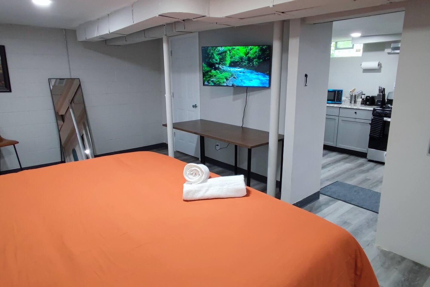 Discover Your Urban Retreat in Indianapolis Welcome to our spacious basement converted living space featuring a bedroom , bonus game room, offering the perfect blend of comfort and convenience. Located approximately a mile from the vibrant Indianapolis Fairgrounds, surrounded by a myriad of restaurants, bars, and coffee shops, you'll enjoy the best of both worlds right at your doorstep. Prime Location: Nestled just under 6 miles from Downtown Indianapolis, a short 10-mile drive to Carmel and Fischer's, and conveniently only 21 miles from Indianapolis International Airport, you're strategically positioned to explore the city and beyond. Whether your visit is for business or leisure, your desired destination is always within reach. Unique Features: Experience the unique charm of this basement unit, meticulously designed to provide both comfort and privacy. Multiple doors offer separate entrances, allowing you to enjoy a sense of seclusion while still relishing in the modern home's amenities. Relax in the living room with a generous 65-inch smart TV, prepare culinary delights in the fully equipped kitchen, and rejuvenate in the plush king-size bed. For additional guests, two comfortable sofa beds are readily available. Nearby Attractions: Indianapolis Fairgrounds: 1 mile (walking distance) Downtown Indianapolis: Less than 6 miles Carmel and Fischer's: Only 10 miles away Indianapolis International Airport: Just 21 miles Amenities: Free on-site parking Thoughtfully furnished for your convenience Game room for added entertainment High-speed Wi-Fi to keep you connected Modern, fully equipped kitchen Spacious king bed for restful nights Two comfortable (small) sofa beds for extra guests 65-inch smart TV for your entertainment needs This Studio is also equipped with the following - Comfy memory foam Queen Bed with mattress protector. - Night Stand with lamp that has USB connection to charge your phone next to the bed. - Desk and a chair to get some work done. - 2 Futons that turns into bed - Closet with hangers - Walking Closer with Hangers - Fully equipped Kitchen that you can prepare a meal. - Dinning Table with 2 chairs - Gas Stove with oven - Full size fridge - Microwave - Toaster - Hot water kettle - Sink with hot and Cold water - Pots and pans to prepare your favorite meal and save money eating out. - Baking Sheets - Cleaning supplies (under the sink) - Plates and Utensils - Coffee and Coffee maker. - Coffee Mugs - Wine glasses and wine opener - Dining table and 2 Chairs - Full size bathroom has - Iron - Ironing board - Shower with Tub - Hot and Cold water - Vanity - Toilet - Toiletries - Towels - Washcloth (complimentary) -The place is also designed with beautiful wall arts as well. This basement conversion apartment is designed and remodeled to make our guests feel home away from home.